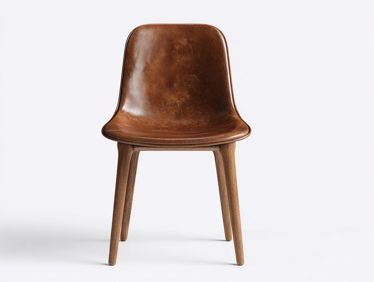 Die Sitzschale ist mit braunem Leder bezogen, das eine natürliche Oberfläche und angenehme Haptik bietet. Das stabile Gestell aus Holz sorgt für zuverlässige Standfestigkeit und ergänzt das Gesamtbild mit einer warmen Ausstrahlung. Die Verarbeitung ist präzise ausgeführt und auf den täglichen Gebrauch ausgelegt.