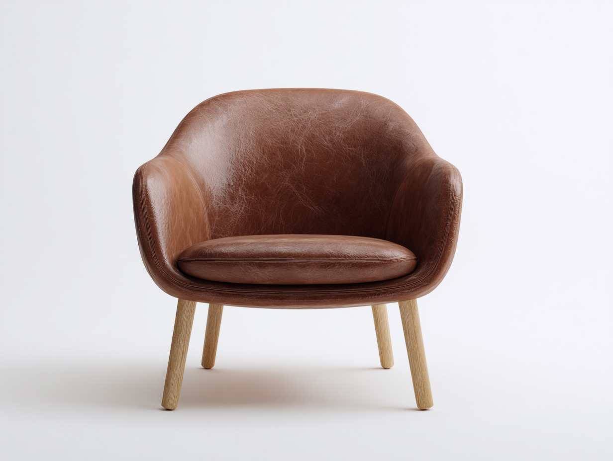 Die Sitzfläche ist mit braunem Leder bezogen, das eine natürliche Struktur und eine warme Ausstrahlung bietet. Das Gestell aus Holz sorgt für Stabilität und unterstreicht die hochwertige Gesamtoptik. Die sorgfältige Verarbeitung gewährleistet eine zuverlässige Nutzung im Alltag.