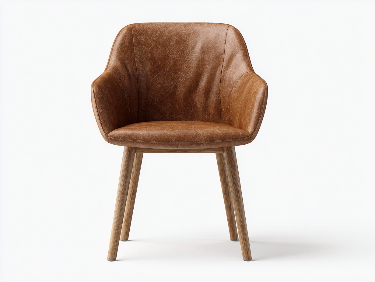 Die Sitzfläche ist mit braunem Leder bezogen, das eine natürliche Struktur und eine warme Ausstrahlung bietet. Das Gestell aus Holz sorgt für Stabilität und ergänzt das Gesamtbild mit einer wohnlichen Note. Die Verarbeitung ist präzise ausgeführt und unterstützt eine zuverlässige Nutzung im Alltag.