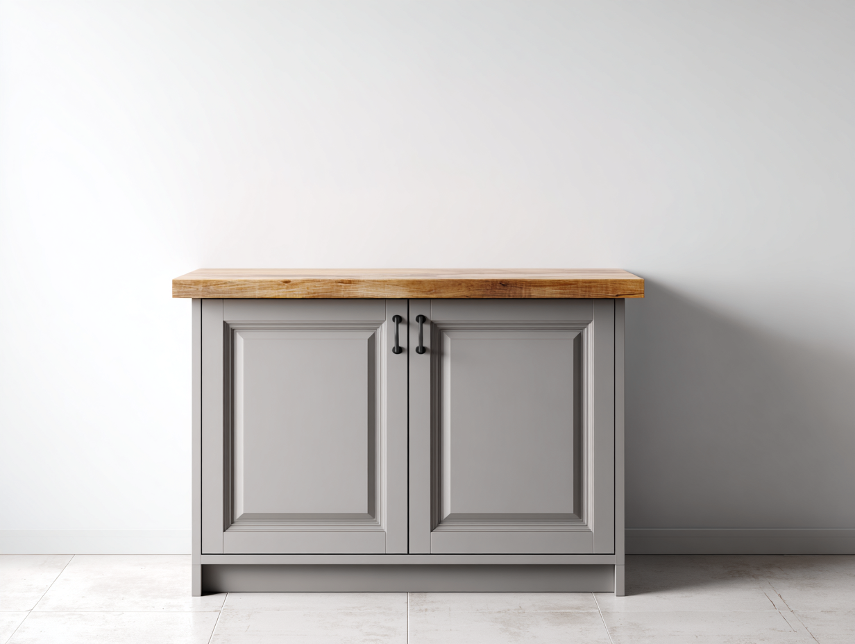 Hergestellt aus Holz, MDF und Metall. Die Oberfläche ist in Grau ausgeführt und wird durch eine stabile Platte in Natur ergänzt. Die Verarbeitung ist solide und auf eine langfristige Nutzung ausgelegt. Die Metallgriffe runden das funktionale Design ab.
