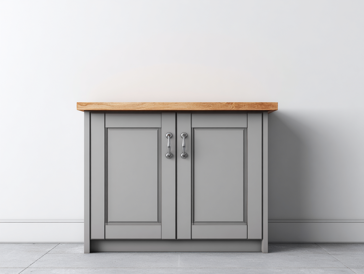 Dieses Sideboards Möbelstück im klassischen Landhausstil bietet eine ausgewogene Kombination aus Funktionalität und zeitloser Gestaltung. Es eignet sich für Wohn- und Essbereiche und schafft zusätzlichen Stauraum für den täglichen Gebrauch. Die natürliche Holzoptik der oberen Platte ergänzt den grauen Korpus und sorgt für eine harmonische Gesamtwirkung.
