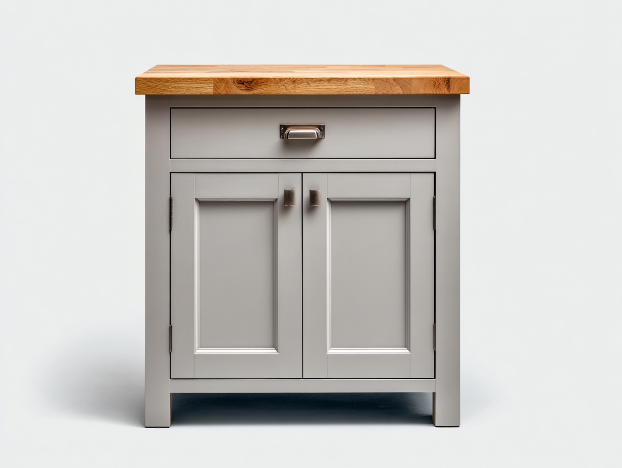 Die Schublade eignet sich zur Aufbewahrung kleiner Gegenstände wie Besteck oder Küchenzubehör. Hinter den Türen befindet sich geschützter Stauraum für Geschirr oder Haushaltsartikel. Die obere Fläche kann zusätzlich als Arbeits- oder Ablagefläche genutzt werden.