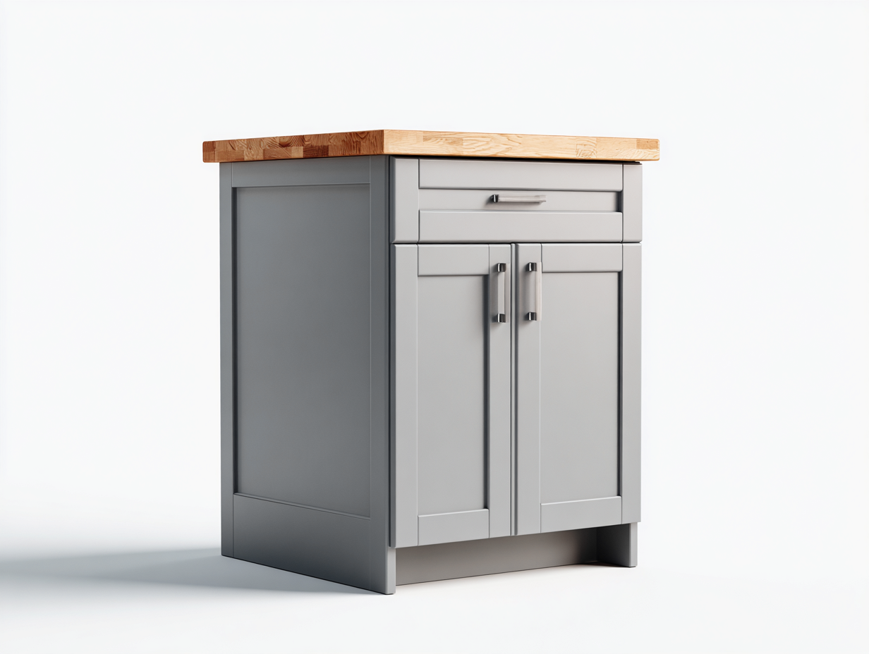 Die obere Schublade eignet sich zur Aufbewahrung von Besteck oder kleinen Gegenständen. Hinter den Türen befindet sich Stauraum für Geschirr, Vorräte oder Haushaltsartikel. Die stabile Oberplatte kann zusätzlich als Arbeits- oder Ablagefläche genutzt werden.